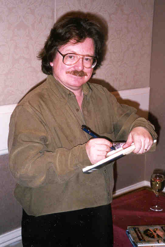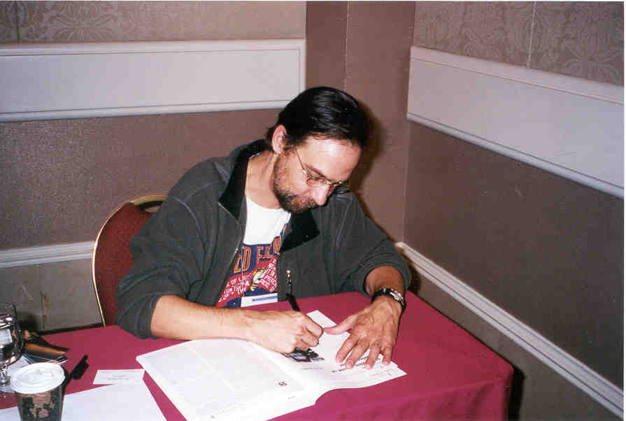 This is a web page with pictures from the World Fantasy Con 25, in Providence, Rhode Island, Nov. 4-7, 1999. My wife and I flew up and had a pretty nice time. It's a small con, and almost completely literary. There were no actors or movie people, just writers (although you could argue that Brian and Wendy Froud are movie people!) The writers were very friendly, and since the con was pretty small they weren't too swamped to talk to people. In particular, we had very nce conversations with Brian Froud (an artist my wife likes) and Paul di Fillippo (a science fiction writer I like.)